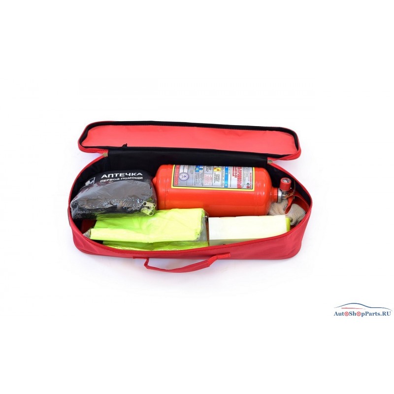 Аварийный комплект"СТАНДАРТ 3S+"(красная нейлоновая сумка, огнетушитель ОП-2(з), аптечка, знак аварийной остановки (Евростандарт), трос 3т., перчатки х/б).