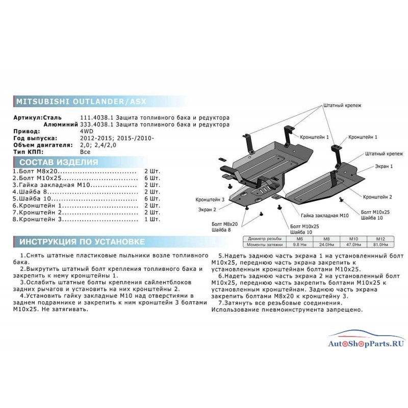 Защита топливного бака и редуктора для Mitsubishi Outlander V - 2.0